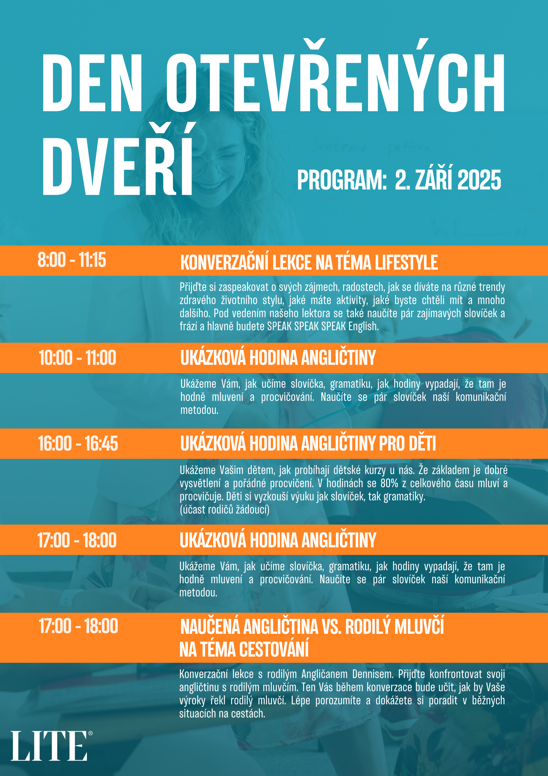 Den otevřených dveří je ideální příležitostí zjistit, zda je pro vás LITE ta správná volba. Ať už začínáte od nuly, nebo si chcete angličtinu jen oprášit, najdete u nás kurz přesně pro vás.